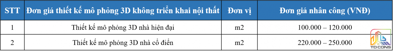 Đơn giá thiết kế mô phỏng 3D không triển khai nội thất